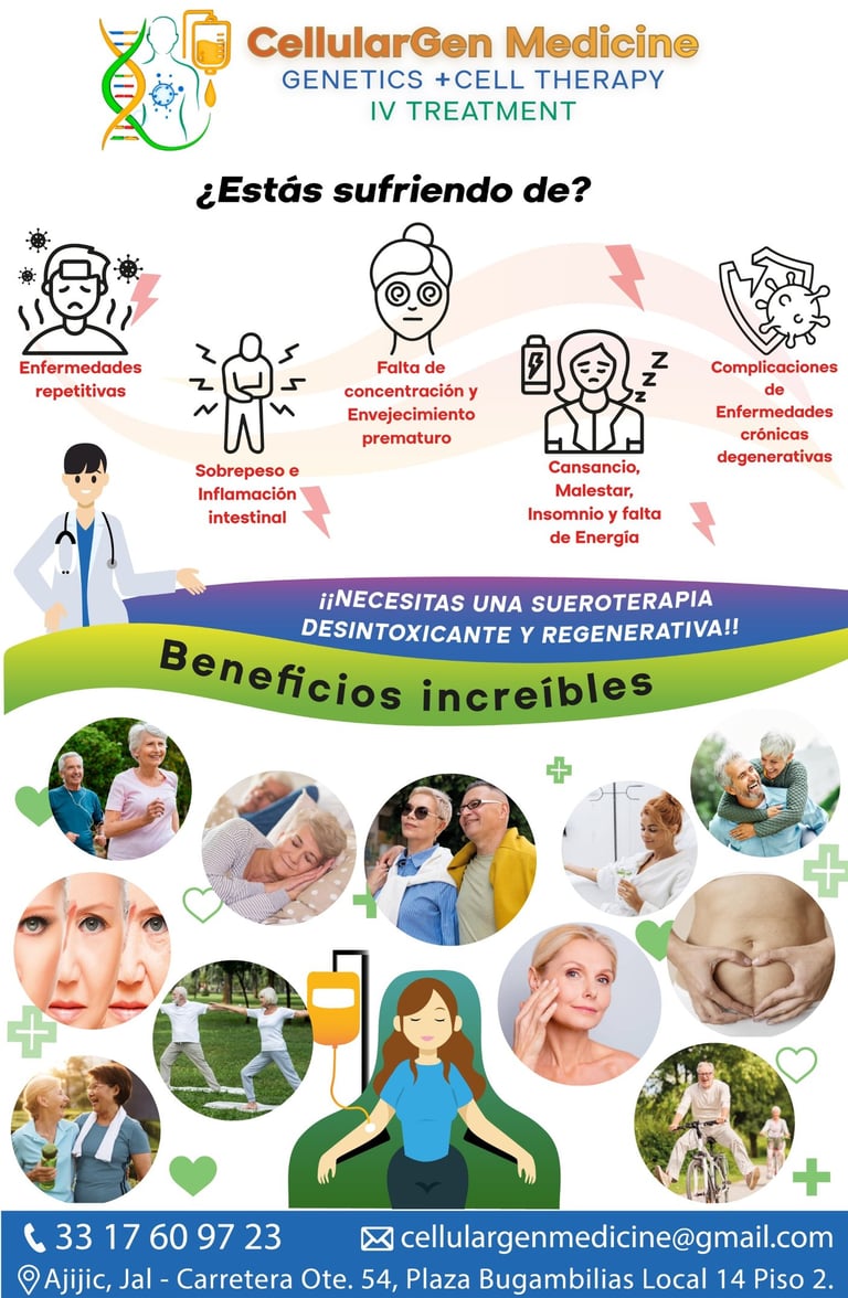 En Cellular Gen Medicine, nos dedicamos a ofrecer tratamientos innovadores, incluyendo sueroterapia y células madre, liderados por expertos en medicina genética para mejorar tu salud y bienestar.